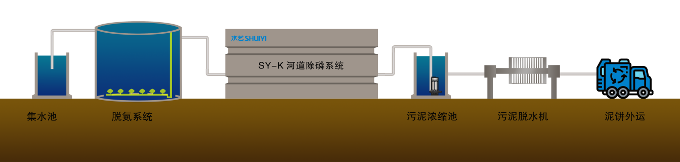 SY-K河道脫氮除磷系統設備高度集成,生化反應快速,去除效率高、出水水質好、可直接回用。從缺氧反應池回流污泥到厭氧反應室,創造了有利于聚磷菌的厭氧釋磷的環境,強化了聚磷菌的生物選擇,從而實現高效除磷脫氮。